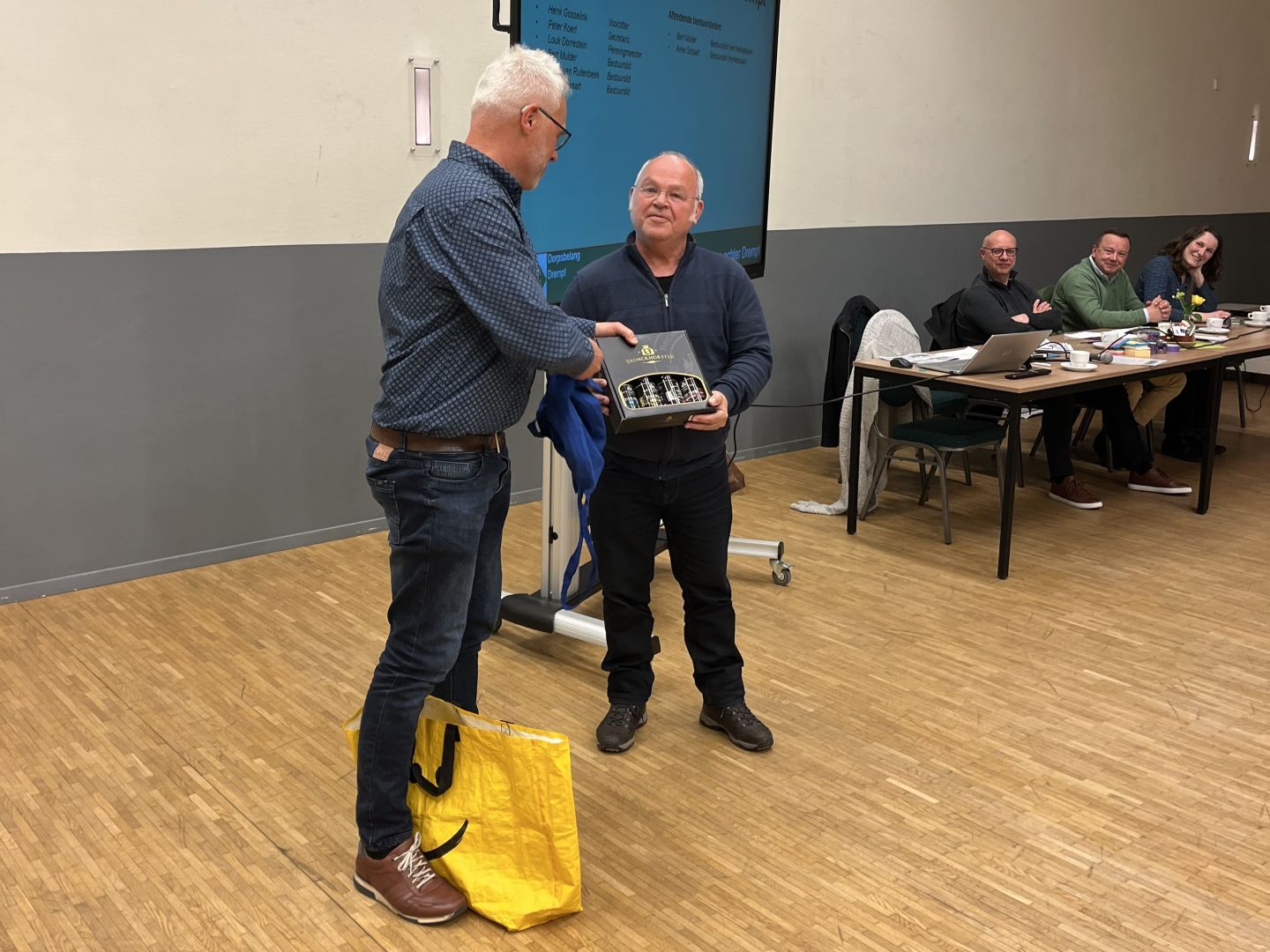 • foto: voorzitter Henk Gosselink (l) bedankt bestuurslid Bert Mulder (r) voor de plezierige samenwerking